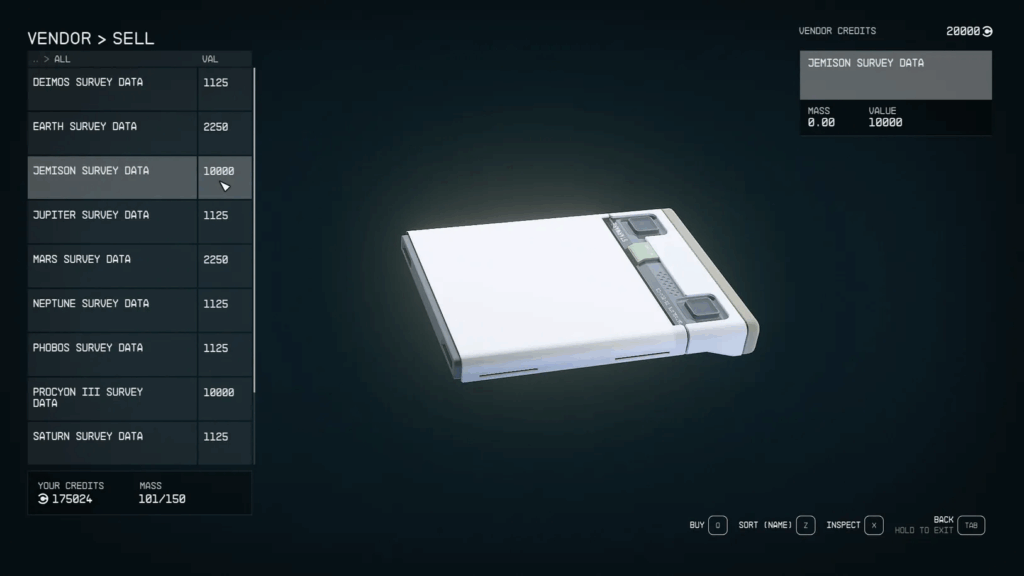 If you can wait, don’t just immediately sell them to regular merchants! Wait until you progress a little farther into the main story and meet Vladimir, who can be found on The Eye space station above Jemison. He will pay a premium price for all Survey Data, bagging you some extra Credits just for scanning the planet you were most likely scanning anyway.